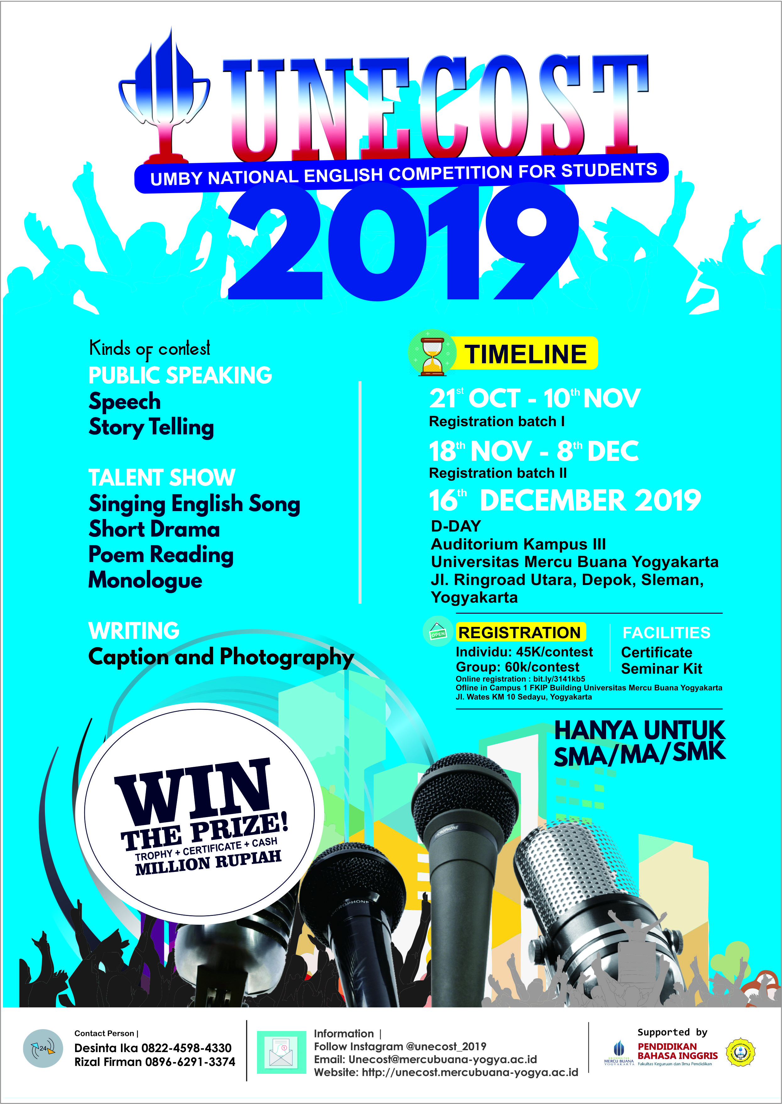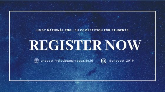 Halo para siswa SMA/SMK/MA SederajatYuk salurkann bakat bahasa Inggris kalian dalam acara Unecost (UMBY National English Competition for Students) tingkat nasional yang akan diselenggarakan pada 16 Desember 2019. Untuk pendaftaran dibuka mulai 1) Gelombang...